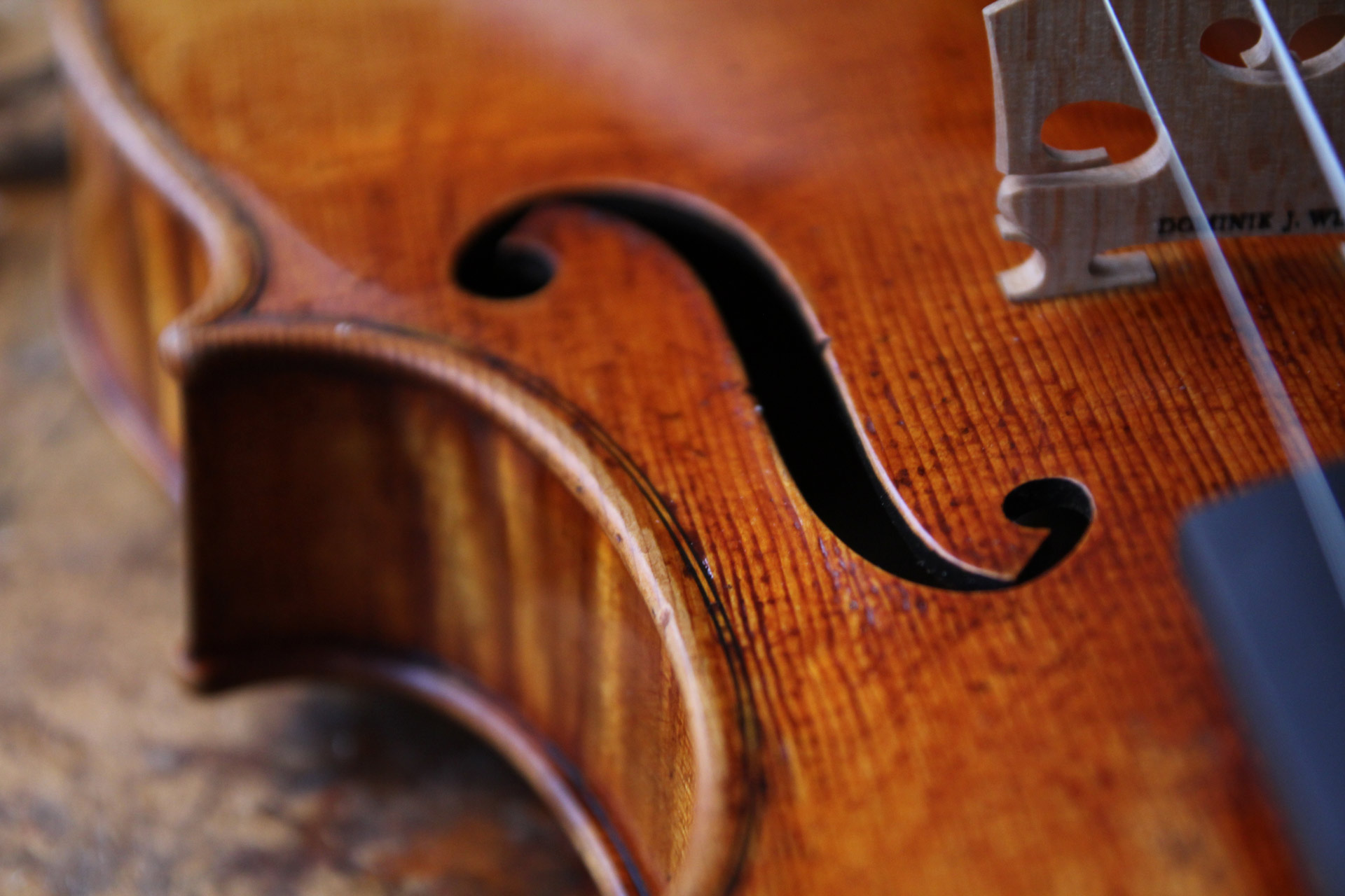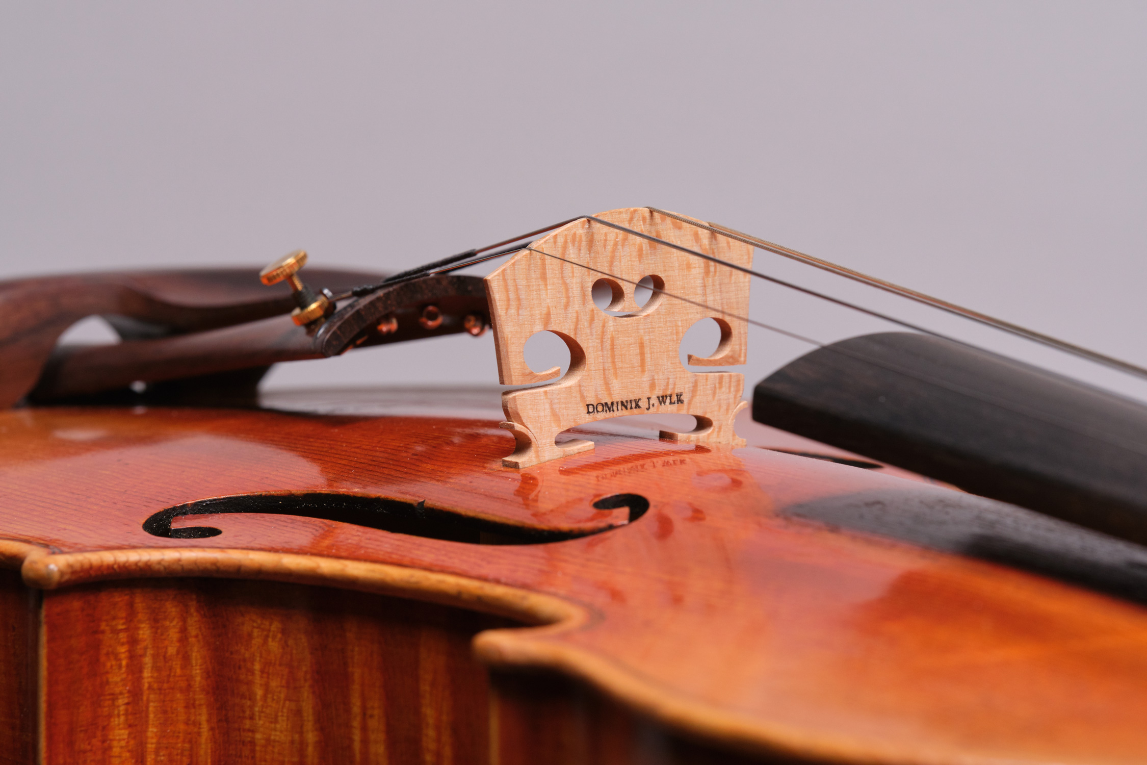 도미닉 요셉 윌크는 자신만의 독창적인 모델을 바탕으로 바이올린, 비올라, 첼로를 제작합니다. 앤틱 마감 처리를 한 그의 악기들은 마치 올드악기처럼 보일 수 있으나, 각 악기들은 고유한 특성과 외형,